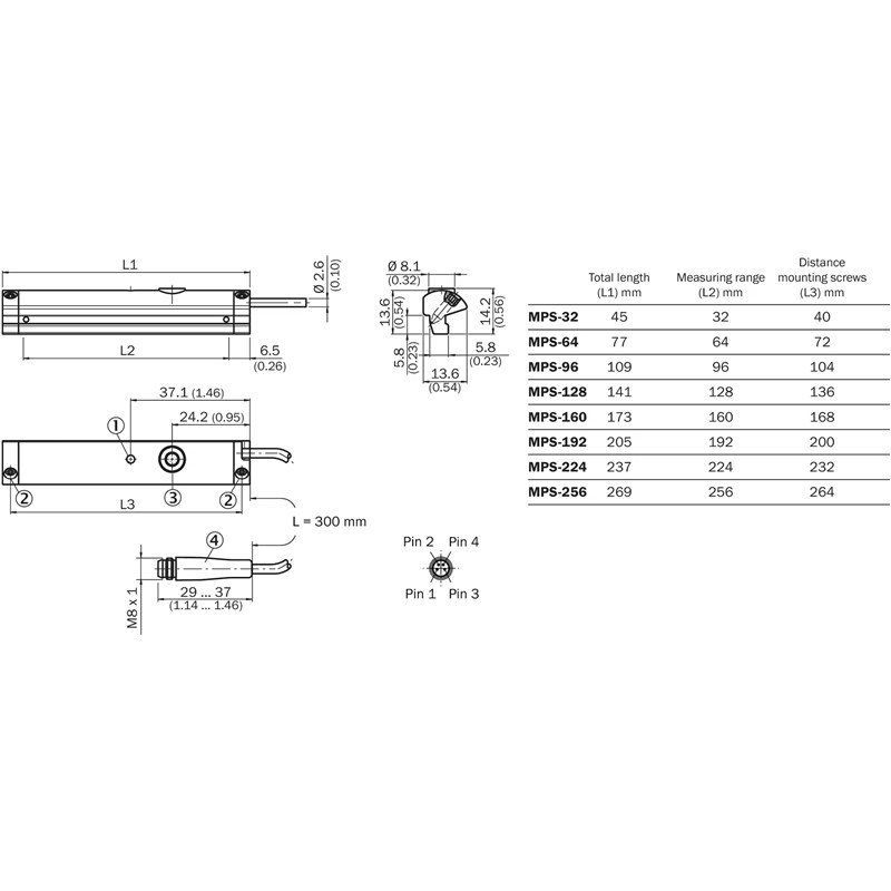 Détecteur magnétique vérins à sortie analogique; Applications: Vérins avec rainure en T; Version électrique: 4 fils DC; Plage de mesure: 32 mm; Sortie analogique: 4-20mA ou 0-10V; Interface de communication: -; Raccordement: Câble avec connecteur mâle M8, 4 pôles, 0,3 m; Indice de protection: IP67 (EN 60529); Série: MPS-T