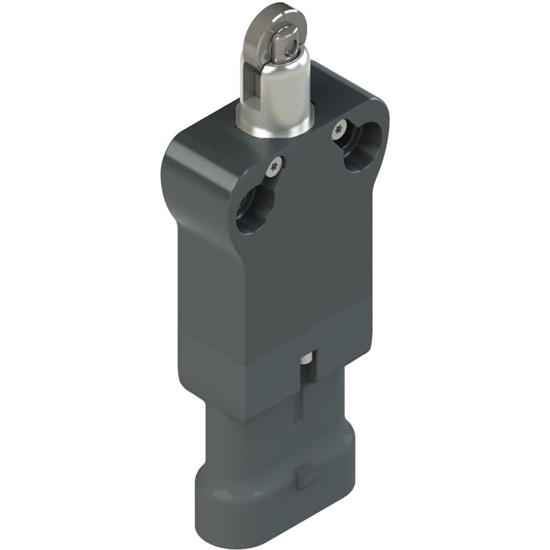 Interrupteur précablé modulaire à poussoir à galet; Boîtier: Boîtier en métal, entr'axe trous de fixage 25 mm; Blocs de contact: 1NO+1NC rupture brusque (B11); Ouverture positive: Oui ; Tête: À poussoir à galet; Type de connexion: Connecteur AMP Superseal 1,5; Type de contacts: Contacts en argent; Degré de protection: IP67 selon EN 60529 et IP69K selon ISO 20653; Température ambiante: -25°C ... +80°C; Série: NB