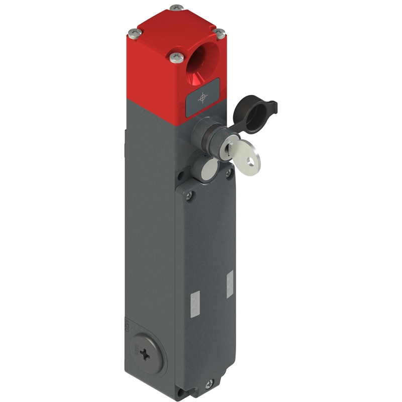 Interrupteur de sécurité RFID avec verrouillage série NG; Boîtier: Boîtier métallique, trois entrées câbles filetées M20x1,5; Degré de protection: IP67 selon EN 60529 et IP69K selon ISO 20653; Tête: Tête orientable non détachable avec dispositif de déverrouillage à serrure; Principe de fonctionnement: Principe D, actionneur verrouillé avec électroaimant désexcité; Entrées: - 2 entrées sécurisées pour raccordement en série - 1 entrée de programmation - 1 entrée d’activation du électroaimant; Sorties: - 2 sorties sécurisées OSSD PNP - 1 sortie de signalisation "protection fermée" - 1 sortie de signalisation "protection verrouillée"; Activation sorties OS: Mode 1: sorties de sécurité OS actives avec protection verrouillée; Configuration de couvercle:: couvercle standard.; Actionneur: Sans; Connecteurs pré-installés: Connecteur M12 à 12 pôles en bas; Longueur du bouton de déverrouillage: Pour une épaisseur de paroi de 15 mm max