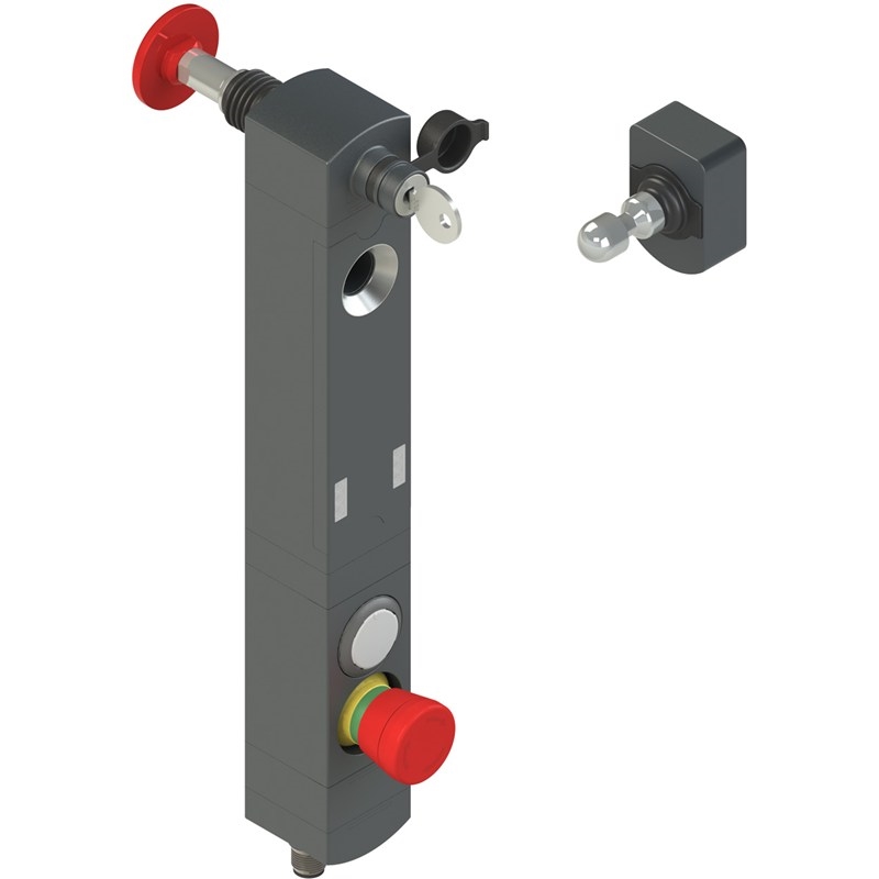 Interrupteur de sécurité avec verrouillage avec dispositifs de commande intégrés, avec actionneur; Boîtier: Boîtier en technopolymère; Principe de fonctionnement: - Principe D, actionneur verrouillé avec électroaimant désexcité, - Mode 1 : sorties de sécurité OS actives avec protection verrouillée; Entrées et sorties : - 2 entrées de sécurité IS1-IS2, - 2 sorties de sécurité OS1-OS2, - 1 sortie de signalisation « actionneur inséré » O3, - 1 sortie de signalisation « actionneur verrouillé » O4, - 2 entrées d'activation électroaimant IE1-IE2, - 1 entrée de programmation / réarmement I3; Sens de sortie des connexions: Câble ou connecteur en bas; Type de connexion: Deux connecteurs M12 (8 pôles + 12 pôles) ; Actionneur: Avec actionneur avec haut niveau d’encodage VN NS-F41; Déverrouillage auxiliaire orientable: Déverrouillage modulaire frontal avec serrure et bouton de déverrouillage antipanique arrière; Configuration des boutons: 2 dispositifs; Position 1: 1 bouton blanc 1NO; Position 2: 1 bouton d’arrêt d’urgence rouge, déblocage par rotation, 2NC; Degré de protection: IP65 selon EN 60529