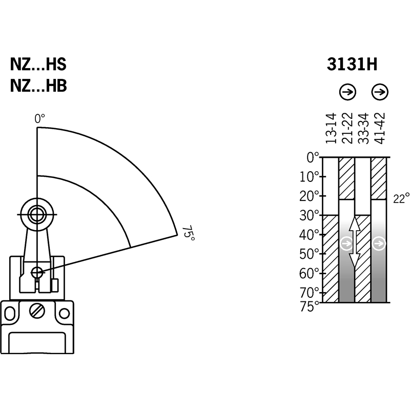 Interrupteur de position de sécurité de type 1; Boîtier: Métallique, version A selon EN 50041; Contacts: Élément de contact à action dépendante 2 O + 2 F; Actionneur: Levier à galet en acier ø 18 mm; Entrée de câble: M20 x 1,5 (1-conduit); Raccordement: Bornier à vis; Matériau du boîtier: Alliage léger moulé sous pression, anodisé; Classe de protection: IP67; Température ambiante: –25 ... 80°C; Série: NZ.HS