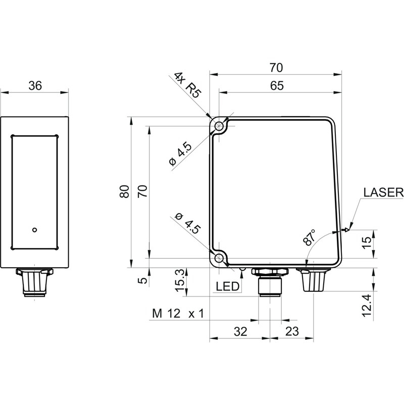 Capteur de profil multifonctions; Fonction: Modes de mesures (M): Hauteur, Droite / Angle, Surface , Bord, Largeur/Gap, Bord d'intensité, Caliper Z, Caliper X, Distance Caliper, Cercle Jauge d'angle, Profil in x-z; Plage de mesure (MR): 100 mm; Zone aveugle (CD): 150 mm; Distance de travail (Sdc ... Sde): 150 ... 250 mm; Source lumineuse: Laser, Lumière rouge, Classe 1; Forme du point lumineux (à distance de référence): Line Length (x) 130 mm, Width (z) 350 µm; Logiciel / Paramétrage: Serveur Web intégré pour le paramétrage; Interface / Circuit de sortie: Serie RS485, 2x Sortie commutation, Sortie analogique; Protocôle: Modbus RTU, IO-Link; Plage de tension +Vs: 18 ... 30 VDC; Sortie analogique: 4-20mA, 2-10mA, 0-10V, 0-5V; Sorties de commutation: 2 x Sortie commutation (Push-Pull); Matériau: Boîtier: Zinc moulé sous pression; Face avant (optique): PMMA; Dimensions (L x H x P): 36 mm x 80 mm x 70 mm; Classe de protection: IP 65 (IEC 60529); Température ambiante: 0 ... + 45 °C; Série: OXM