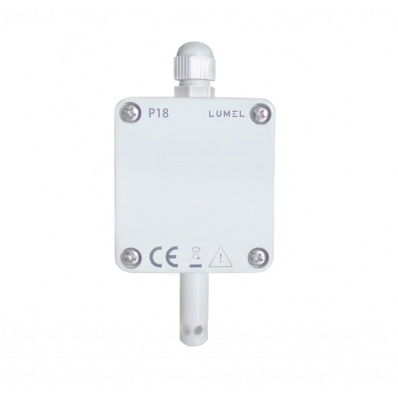 Transducteur de mesure de température (-30...+60°C) et d'humidité (0...100%HR) P18. Interface RS-485 Modbus. 2x sorties analogiques 4...20 mA. Capteur sur le boîtier. IP65