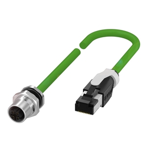 Câble PROFINET préconfectionné, type B, CAT5e, blindé, quarte en étoile, AWG 22, souple (7 fils), RAL 6018 (jaune/vert), traversée de paroi M12, femelle, 4 pôles, détrompage D, sur connecteur mâle RJ45 , longueur : 1 m