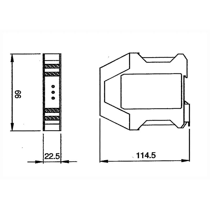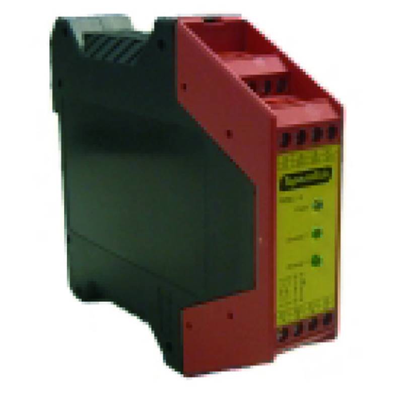 Relais de sécurité; Type: Unité de contrôle pour applications de sécurité et installation dans armoire électrique; Catégorie relais: Catégorie 3 - EN954-1; Entrées Sorties: 3 contacts N/O; 1 contact N/C; Consommation: < 5 VA; Temps de réponse: 30 ms; Mode de réarmement: Manuel ou automatique; Tension d'alimentation: 24 Vac/dc; Fixation Montage: Rail DIN; Dimensions: 115 mm x 22,5 mm x 99 mm; Indice de protection: IP20; Température de fonctionnement: -25°C ... +55°C; Poids: 170 g