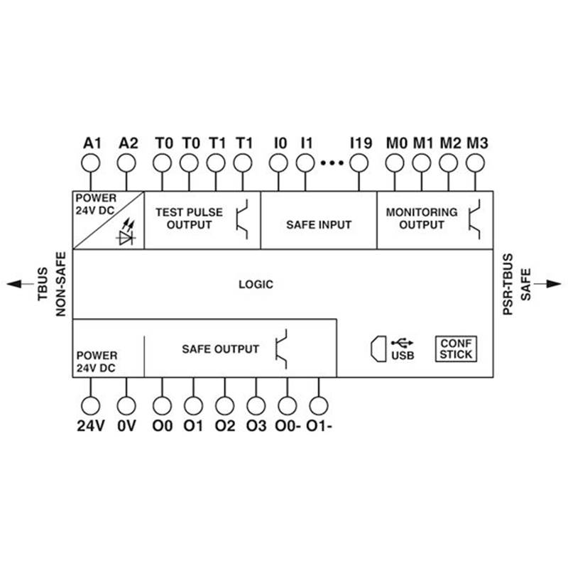 Module de sécurité configurable, avec 20 entrées et 4 sorties de sécurité, 4 sorties de signal, 2 sorties cycliques et 2 sorties de masse; possibilité d'extension avec des modules E/S supplémentaires, jusqu'à la limite de sollicitation SIL 3, cat. 4/PL e, SIL 3, EN 50156, bloc de jonction Push-in enfichable
