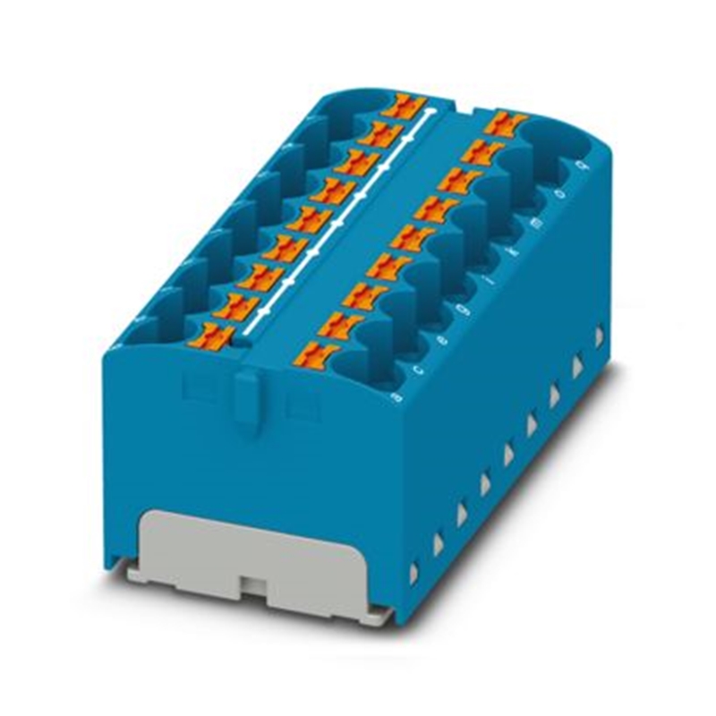 Bloc distributeur, 630 V,32 A, Push-in, nombre de connexions: 18, section :0,2 mm² - 6 mm², AWG: 24 - 10, largeur: 55,4 mm, hauteur: 21,7 mm, couleur: bleu, type de montage: adhésif