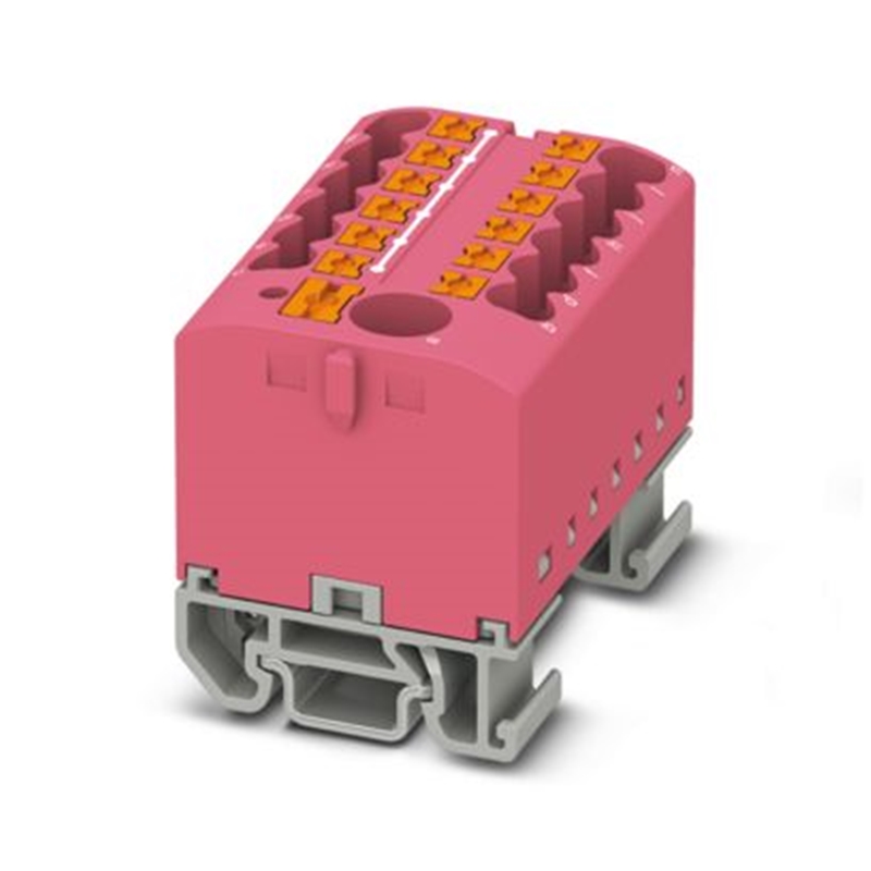 Bloc distributeur, pour montage longitudinal, alimentation intégrée, Push-in, nombre de connexions : 13, sections : 0,14 mm² - 4 mm², largeur : 40,6 mm, hauteur : 30 mm, rose, NS 15