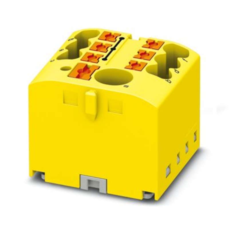 Bloc distributeur, Module de base avec alimentation, Push-in, nombre de connexions : 7, sections : 0,14 mm² - 4 mm², largeur : 25,2 mm, hauteur : 21,2 mm, coloris : jaune, type de montage : adhésif