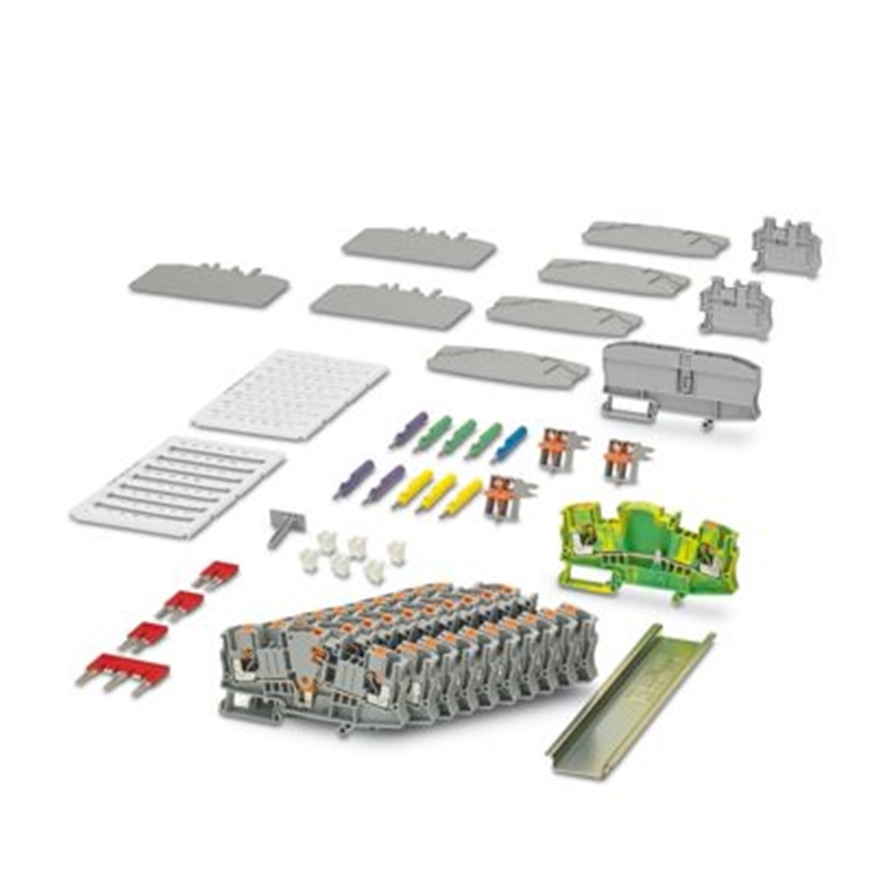 Kit de démarrage composé de Borne de sectionnement avec connectique Push-in, matériel de repérage, accessoires de pontage et de contrôle. Il est possible de mettre en place individuellement une borne plate pour une commutation d