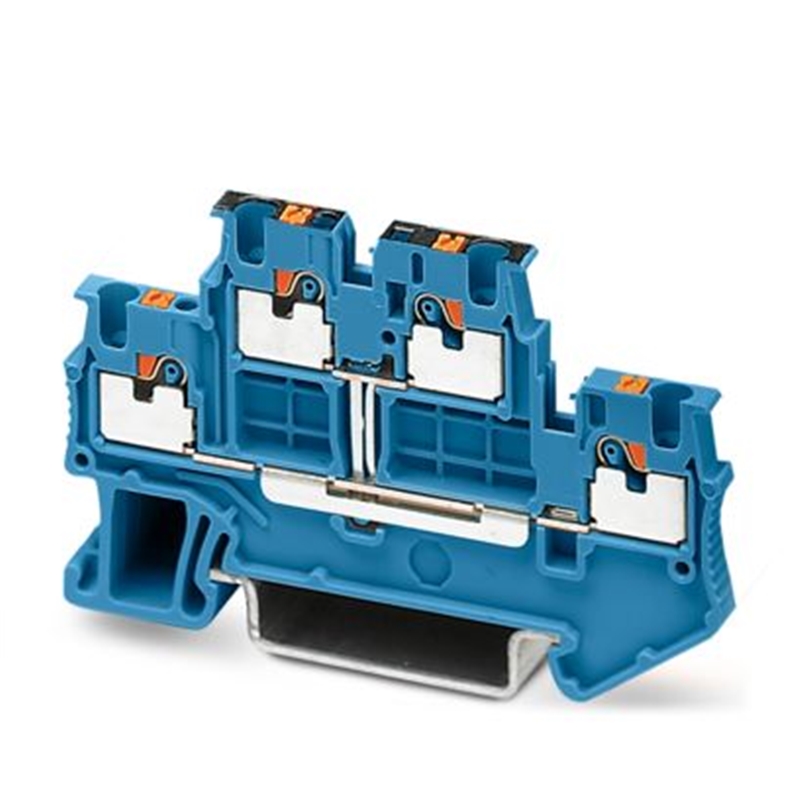 Bornier à double niveau, avec équipotentiel bonder, nom. tension : 500 V, courant nominal : 16 A, type de : Connexion par enfichage, 1er et 2e niveau, : 1,5², section : 0,14² - 1,5², type de montage : NS 35/7,5, NS 35/15, couleur : bleu