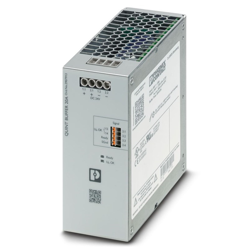 Accumulateur buffer QUINT avec accumulateur d'énergie sans entretien à condensateur pour montage sur profilé, entrée : 24 V DC, sortie : 24 V DC / 20 A, avec adaptateur de profilé universel UTA 107 monté.