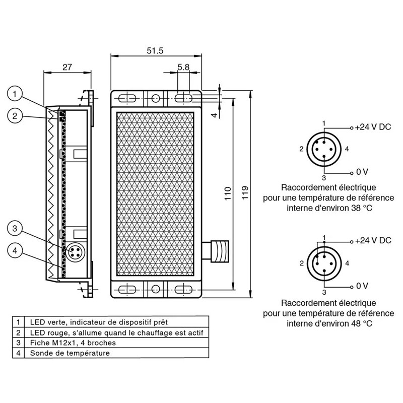 Réflecteur, rectangulaire 120 mm x 51 mm, trous de fixation, chauffage 24 V DC