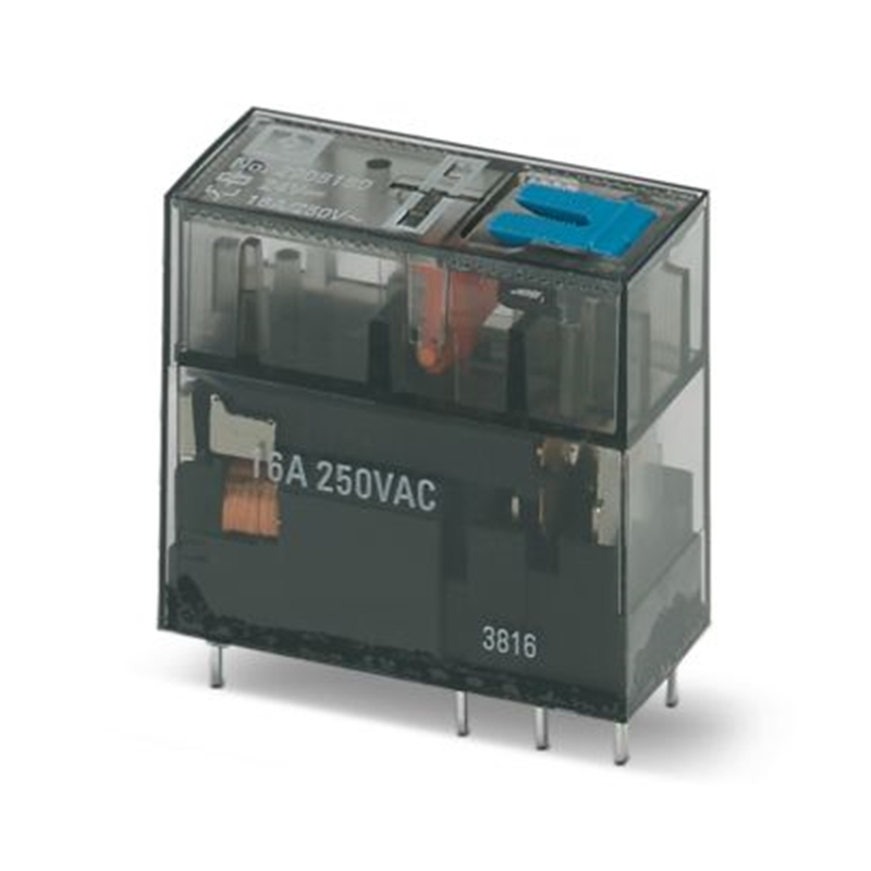 Relais miniature enfichable, avec contact de puissance, 1 contact inverseur, touche de test, affichage mécanique de position, polarité : non polarisé, tension d'entrée : 24 V DC
