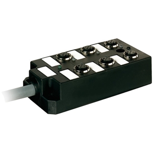 Répartiteur étanche; Type: 6xM12, 5 pôles, avec LED pour signaux PNP logiques 24 V DC; Raccordement capteurs/actionneurs: 6 voies M12 femelle, 5 pôles; Raccordement automate: Bornes enfichables à vis: max. 1.5 mm² (AWG 16); Tension de service: 24 V DC; Courant de service par contact: max. 4 A;...