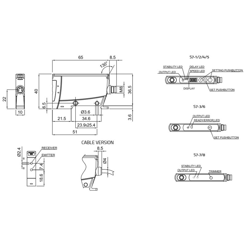 Amplificateur pour fibres optiques; Format: Parallélépipédique; Distance de détection Sn: Dépend de la fibre optique; Réglage de la sensibilité: Teach, Boutons +/-; Afficheur: Oui; Source d'émission: LED, Lumière rouge; Sortie de commutation: PNP; Mode de commutation: Commutation claire/sombre; Temps de réponse: 100 µs; Fréquence de commutation: 5 Khz; Raccordement: Câble 2 m; Tension d'alimentation: 12-24Vdc ± 10%; Dimensions: 10 mm x 65 mm x 40 mm; Matériau du boîtier: ABS; Degré de protection: IP65; Température de fonctionnement: -10 ... 55 °C (hors gel); Homologations: CE, cULus; Série: S7