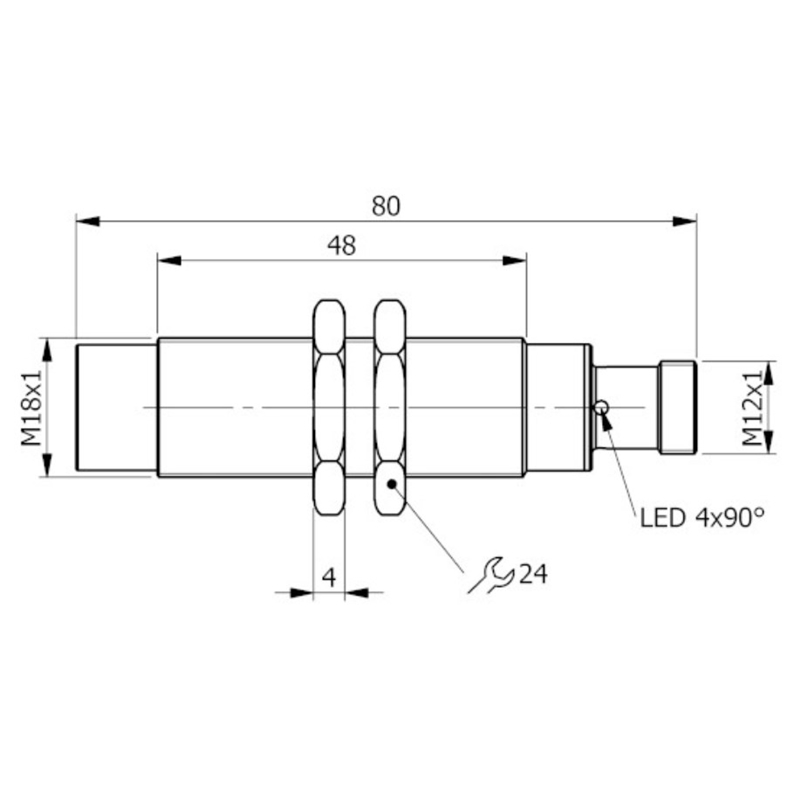 Détecteur de proximité inductif; Format: Cylindrique fileté, M18 x 1; Version électrique: 3 fils DC; Distance de détection Sn: 16 mm; Montage: Non noyable; Sortie de commutation: NPN; Type de commutation: Contact à ouverture (NF); Fréquence de commutation: 200 Hz; Interface de communication: -; Raccordement: Connecteur mâle M12, 4 pôles; Tension d'alimentation: 10-30Vdc; Diamètre: Ø 18 mm; Longueur totale du boîtier: 80 mm; Longueur de filetage utile: 48 mm; Matériau du boîtier: Laiton nickelé; Classe de protection: IP67; Température de fonctionnement: -25 ... +85 °C