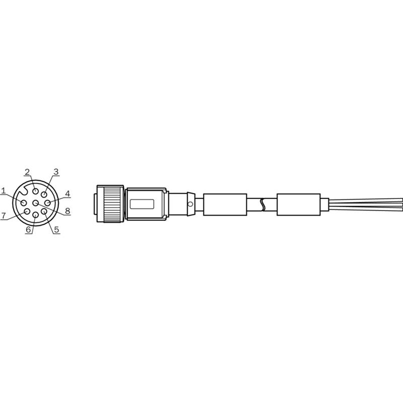 Connecteur / Câble de raccordement; Type: Câble de connexion; Type de signal: RS-232, RS-422; Raccordement A: Connecteur M12, femelle, droit, 8 pôles, codé A; Raccordement B: Extrémité de câble libre; Câble: 5 m, 8 fils (8 x 0,25 mm²); Blindage: Blindé