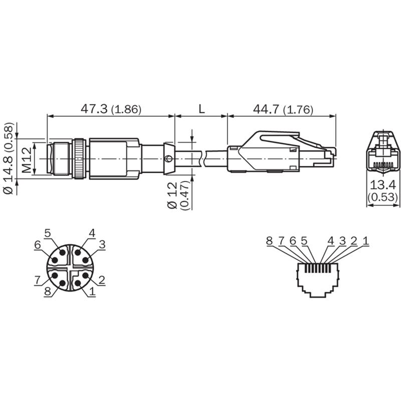 • Raccordement A: Connecteur M12, mâle, droit, 8 pôles, codé X