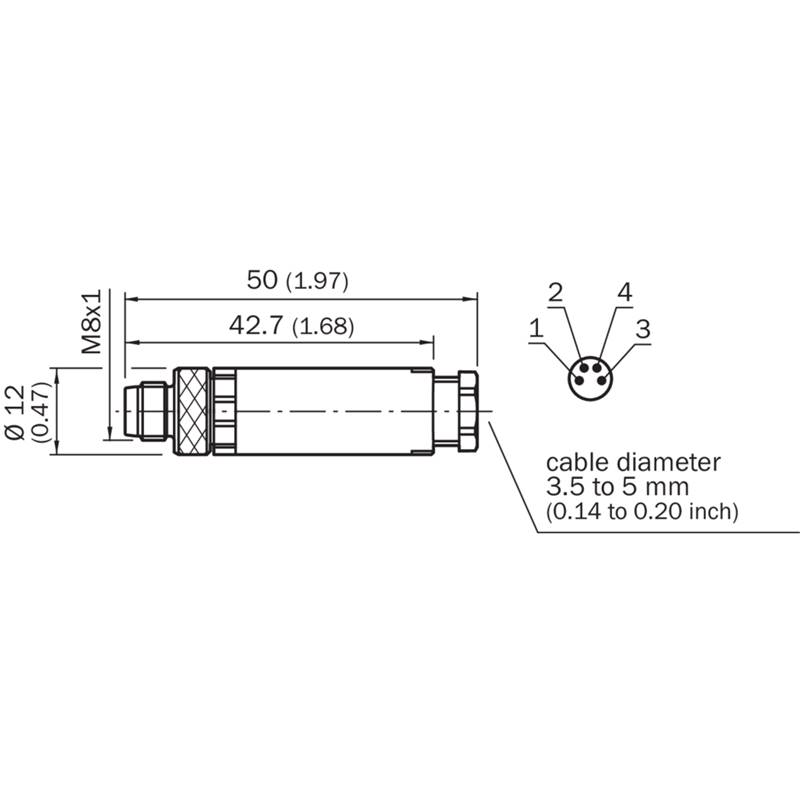 Connecteur / Câble de raccordement; Type: Connecteur confectionnable, M8 x 1; Raccordement A: Connecteur M8, mâle, droit, 4 pôles; Raccordement B: Borniers à vis (x 4); Section du conducteur admissible: 0,14 ... 0,5 mm²; Diamètre de câble admissible: Ø 3,5 ... 8 mm; Blindage: Non blindé; Tension de mesure: max. 60 V; Charge électrique: 4 A; Indice de protection: IP67; Température de service: -40 °C ... +85 °C