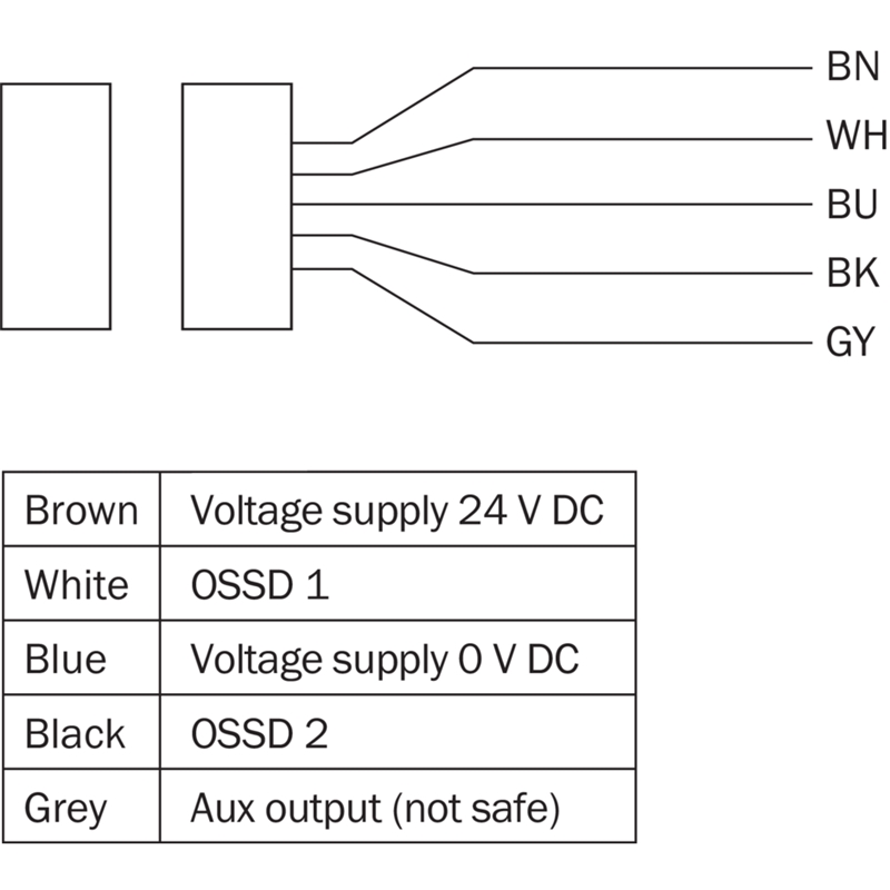 • Contact auxiliaire (AUX): 1 (Comportement de commutation de sens opposé aux OSSD)