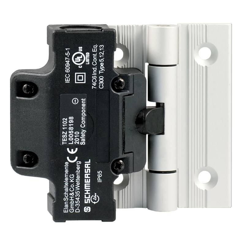 Interrupteur de sécurité sur charnières; Utilisation: Convient pour montage aux profilés: 40 mm; Charnière de fixation: Oui; Charnière supplémentaire: Oui; Nombre de contacts auxiliaires: 1; Nombre de contacts de sécurité: 2; Entrées de câble: 2 conduits M 20 x 1.5; Dimensions: 111,5 mm x 92 mm x 36 mm; Matériau du boîtier: Plastique; Matériau des contacts, électriques: Argent; Matériau du charnière: Aluminium; Etanchéité: IP65; Température ambiante: -25 °C ... +65 °C; Certificats: IFA, cULus, CCC, EAC; Remarque: L'angle d'ouverture réglé en usine est de 4°; Série: TESZ