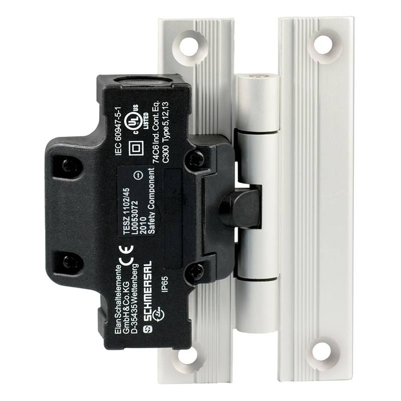 Interrupteur de sécurité sur charnières; Utilisation: Convient pour montage aux profilés: 45 mm; Charnière de fixation: Oui; Charnière supplémentaire: Oui; Nombre de contacts auxiliaires: 1; Nombre de contacts de sécurité: 2; Entrées de câble: 2 conduits M 20 x 1.5; Dimensions: 111,5 mm x 92 mm x 36 mm; Matériau du boîtier: Plastique; Matériau des contacts, électriques: Argent; Matériau du charnière: Aluminium; Etanchéité: IP65; Température ambiante: -25 °C ... +65 °C; Certificats: IFA, cULus, CCC, EAC; Remarque: L'angle d'ouverture réglé en usine est de 4°; Série: TESZ