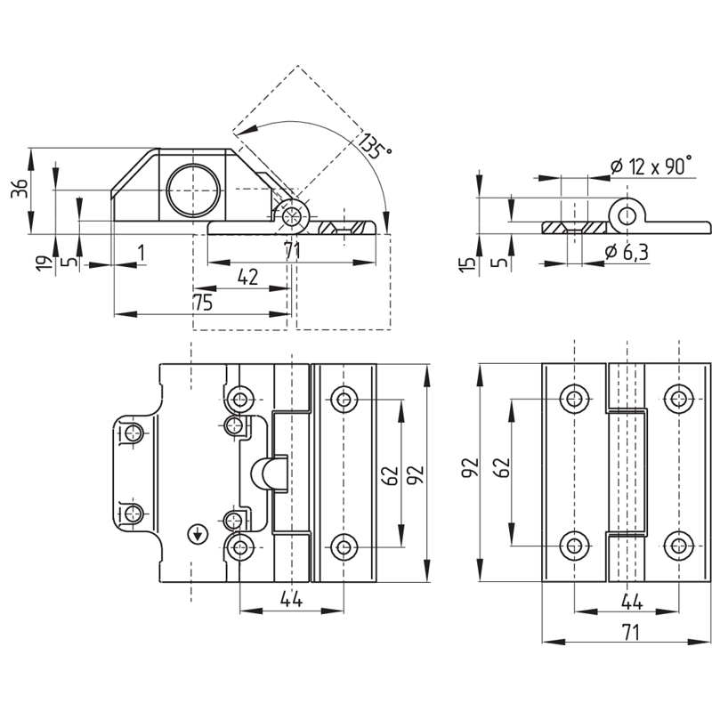 Charnière de sécurité 2O+1F, 10° (PROFIL40) Inox, 2xM20
