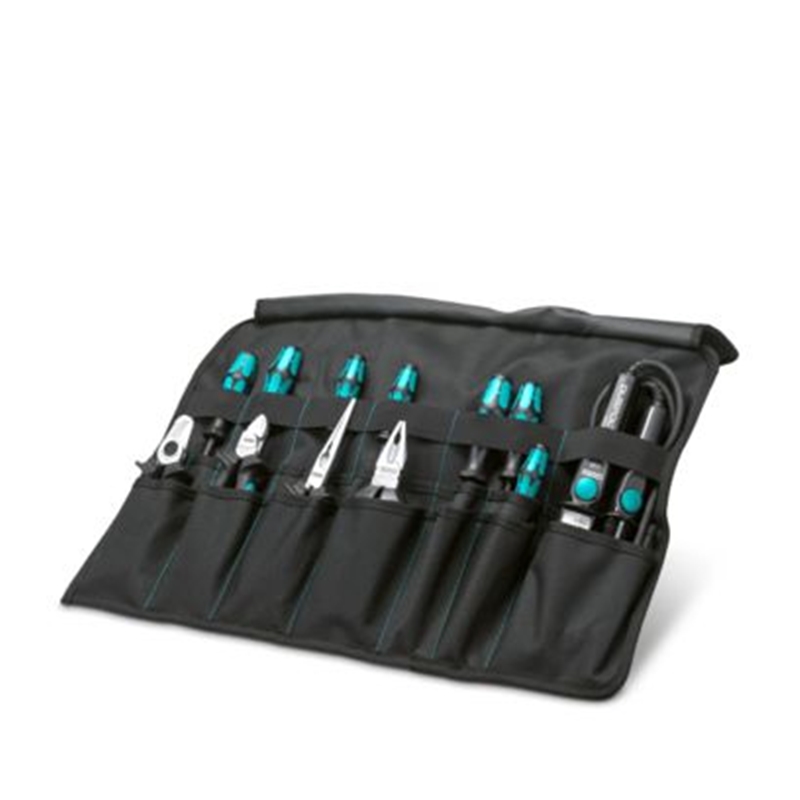 Trousse d'outils contenant : coupe-câble, pince coupante diagonale, pince universelle et pince droite pointue, tournevis à tête fendue VDE : 0,4 x 2,5/0,5 x 3,0/1,0 x 4,0/1,0 x 5,5 cruciforme : PHO/PH1/PH2, Contrôleur de tension