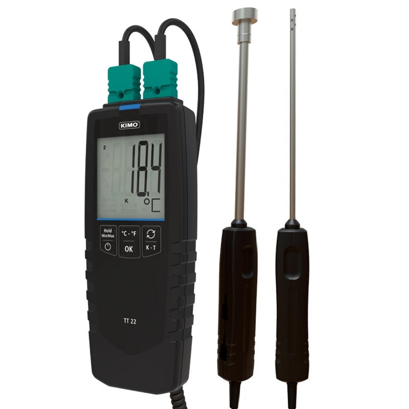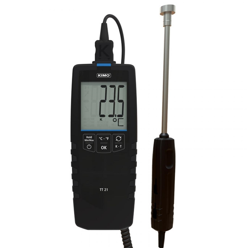 Thermomètre portable type TT 21 thermocouple K, T 1 voie (-200 à +1300°C), afficheur 1 ligne. Fonction : Hold, changement d'unité, Min, Max, sélection type de thermocouple et auto-extinction réglable. Livré avec piles et certificat d'ajustage