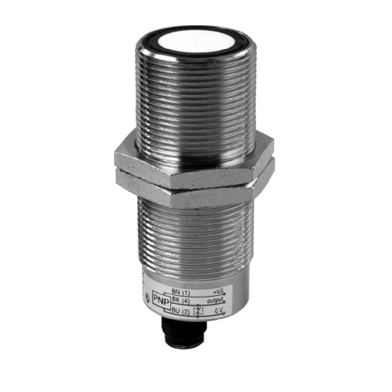 Détecteur à ultrasons; Format: Cylindrique fileté, M30 x 1.5, faisceau axial; Type de détection: Directe sur l'objet; Distance de commutation Sd: 200 ... 1500 mm; Réglage: Potentiomètre; Sortie de commutation: NPN; Type de commutation: Contact à ouverture (NF); Raccordement: Connecteur mâle M12, 4 poles; Tension d'alimentation: 12-30Vdc; Dimensions: Ø 30 mm x 70 mm; Matériau du boîtier: Laiton nickelé; Indice de protection: IP67; Température de fonctionnement: -25 ... +60 °C