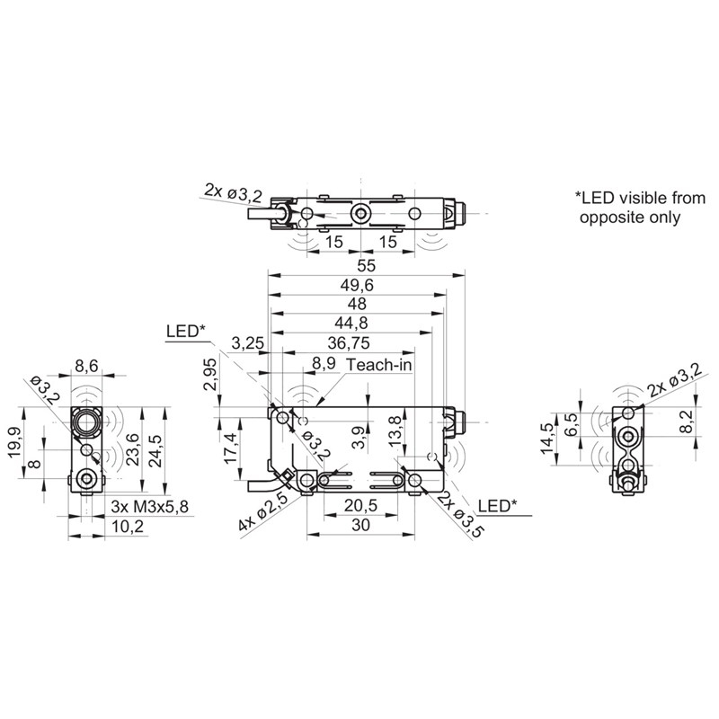 Détecteur à ultrasons; Format: Parallélépipédique, faisceau axial; Type de détection: Barrière reflex; Distance de commutation: 0 ... 200 mm; Réglage: Teach-in; Sortie de commutation: Push-Pull; Type de commutation: Contact à fermeture/ouverture (NO/NF); Raccordement: Câble 2 m; Tension d'alimentation: 12-30Vdc; Dimensions (L x H x P): 8,6 x 55 x 24,5 mm; Indice de protection: IP67; Température de fonctionnement: 0 ... +60 °C; Série: 09