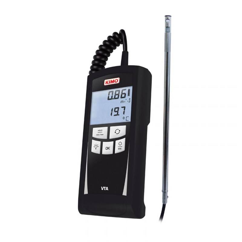 Thermo-Anémomètre à fil chaud portable type VTA, sonde inox déportée Ø 8 mm, longueur 300 mm, câble longueur 2 m, (0,15 à 30 m/s et 0 à +50°C).Afficheur 2 lignes. Fonction: Vitesse, Débit en gaine, Débit aux cônes, Température, moyenne automatique, Hold, Min, Max, rétro-éclairage et autoextinction.Livré avec sacoche de transport et certificat d'ajustage