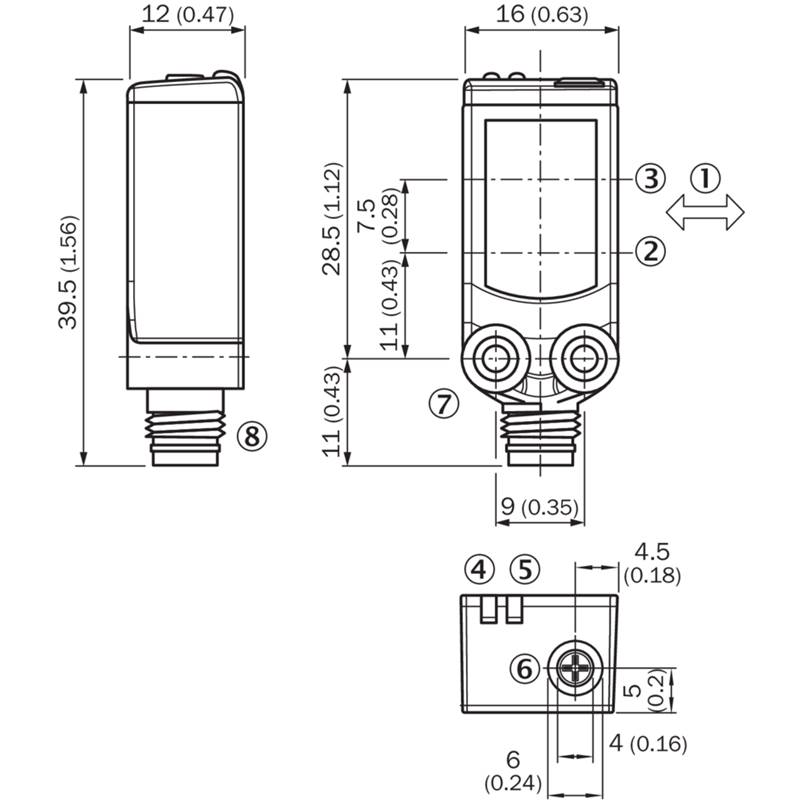 Capteur photoélectrique; Format: Parallélépipédique; Principe du capteur: Détecteur à réflexion directe; Distance de commutation max.: 4 mm ... 150 mm; Réglage: Potentiomètre, 5 tours; Source d'émission: LED PinPoint, Lumière rouge visible; Taille du spot lumineux (distance): Ø 7 mm (50 mm); Sortie de commutation: PNP; Type de commutation: Contact antivalent; Mode de commutation: Commutation claire/sombre; Fréquence de commutation: 1.000 Hz; Raccordement: Câble, 4 fils, 5 m, PVC; Tension d'alimentation: 10-30Vdc; Dimensions (l x H x P): 16 mm x 39,5 mm x 12 mm; Matériau du boîtier: Plastique, ABS; Indice de protection: IP66, IP67; Température de fonctionnement: –40 °C ... +60 °C; Série: W4-3