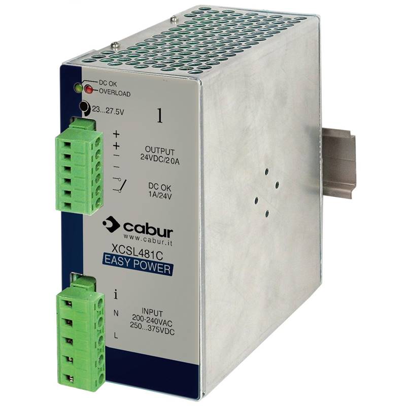 Alimentation à découpage Easy Power; Type: Monophasée; Tension d'entrée: 90 - 264 Vac; Tension de sortie: 24 Vdc; Courant de sortie: 20 A; Courant limite de surcharge: 28 A; Indice de protection: IP 20 IEC 529, EN60529; Mode de raccordemAent: borniers à vis 2.5 mm² extractible; Série: CSL