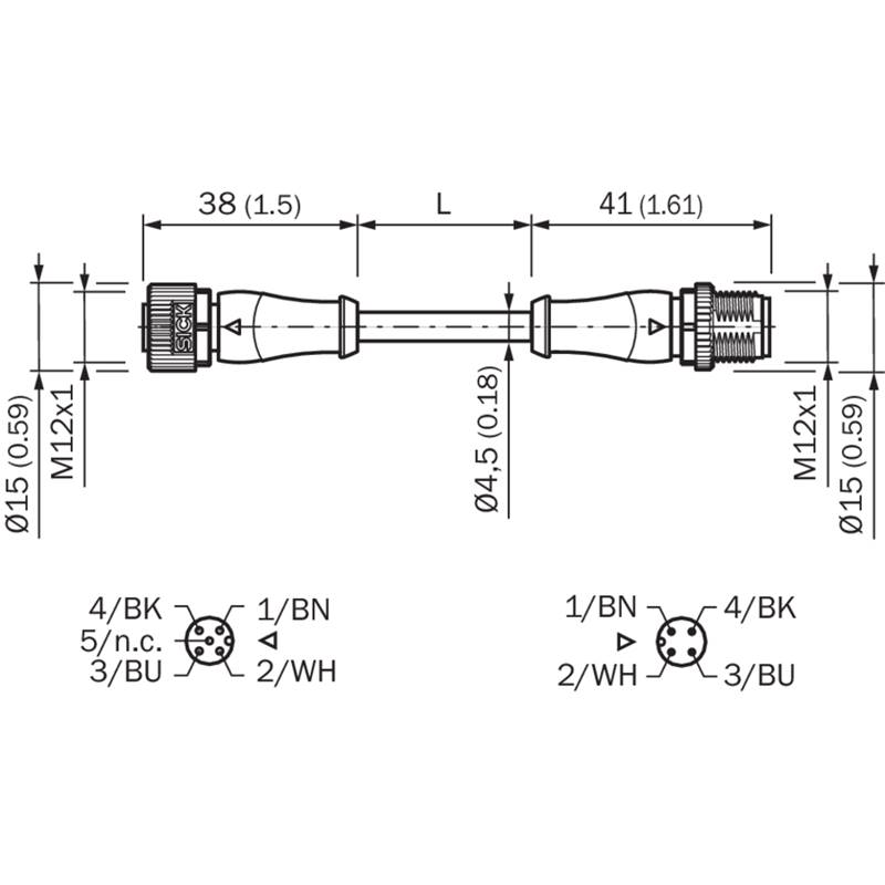 Connecteur / Câble de raccordement; Type: Câble de connexion; Type de signal: Capteur / Actionneur; Raccordement A: Connecteur M12, femelle, droit, 4 pôles, codé A, noir; Raccordement B: Connecteur M12, mâle, droit, 4 pôles, codé A, noir; Câble: 0,6 m, 4 fils (4 x 0,34 mm²), PUR sans halogène, noir; Blindage: Non blindé; Compatible chaîne porte-câble: Oui (2 MM), 10 m/s²; Tension de mesure: max. 250 V DC; Charge électrique: 4 A; Indice de protection: IP65 / IP66K / IP67; Température de service: - En mouvement: –25 °C ... +80 °C- En position fixe: –40 °C ... +80 °C- Mode chaîne porte-câble: –25 °C ... +80 °C- Tête: –25 °C ... +85 °C; Domaine d'utilisation: Domaine de l’huile/des lubrifiants; Homologations: CE, UL