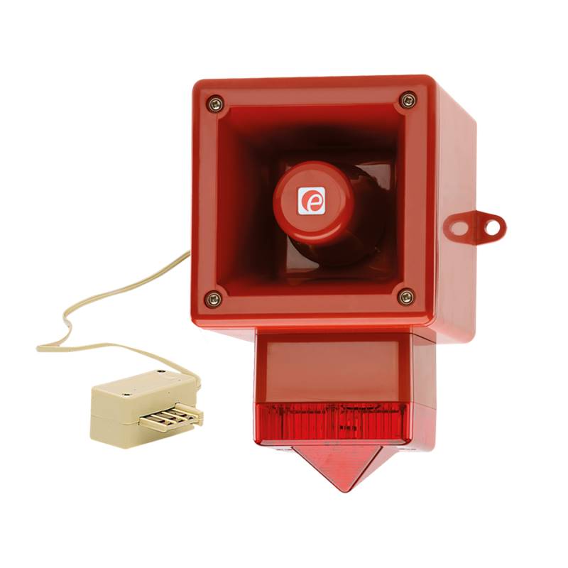 Amplificateur sonore et lumineux pour téléphone 105 dB à 1 m, 5 Joules; Puissance sonore: 105 dB; Nbre de sons: 3; Alimentation: 230 Vca; Puissance lumineuse en Joules: 5 J; Couleur d'optique: rouge; Fréquence du Flash: 1 Hz (60 Flashs / min); Dimensions :- Partie sonore: 130 x 130 x 132 mm- Partie flash: 86 x 86 x 83 mm; Matériau: ABS auto-extinguible; Indice de protection: IP66; Température d'Utilisation: -25 °C ... 55 °C; Prise gigogne: incluse