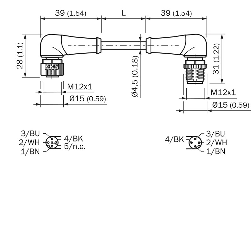 Connecteur / Câble de raccordement; Type: Câble de connexion, M12 x 1 / M12 x 1; Type de signal: Capteur / Actionneur; Raccordement A: Connecteur M12, femelle, coudé, 4 pôles, codé A; Raccordement B: Connecteur M12, mâle, coudé, 4 pôles, codé A; Câble: 1,5 m, 4 fils (4 x 0,34 mm²), PUR, sans halogène, noir; Blindage: Non blindé; Compatible chaîne porte-câble: Oui (10 MM), 10 m/s²; Tension de mesure: max. 24 V DC; Charge électrique: 4 A; Indice de protection: IP65 / IP66K / IP67; Température de service:- En mouvement: –25 °C ... +80 °C- En position fixe: –40 °C ... +80 °C- Mode chaîne porte-câble: –25 °C ... +80 °C- Tête: –25 °C ... +85 °C; Domaine d'utilisation: Domaine de l’huile/des lubrifiants; Homologations: UL