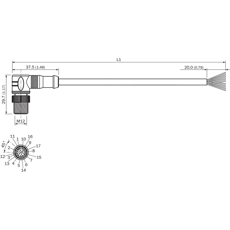 • Raccordement A: Connecteur M12, mâle, coudé, 17 pôles